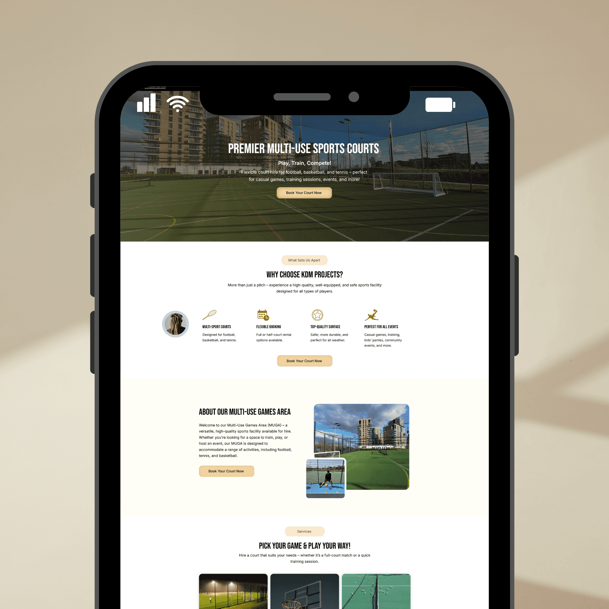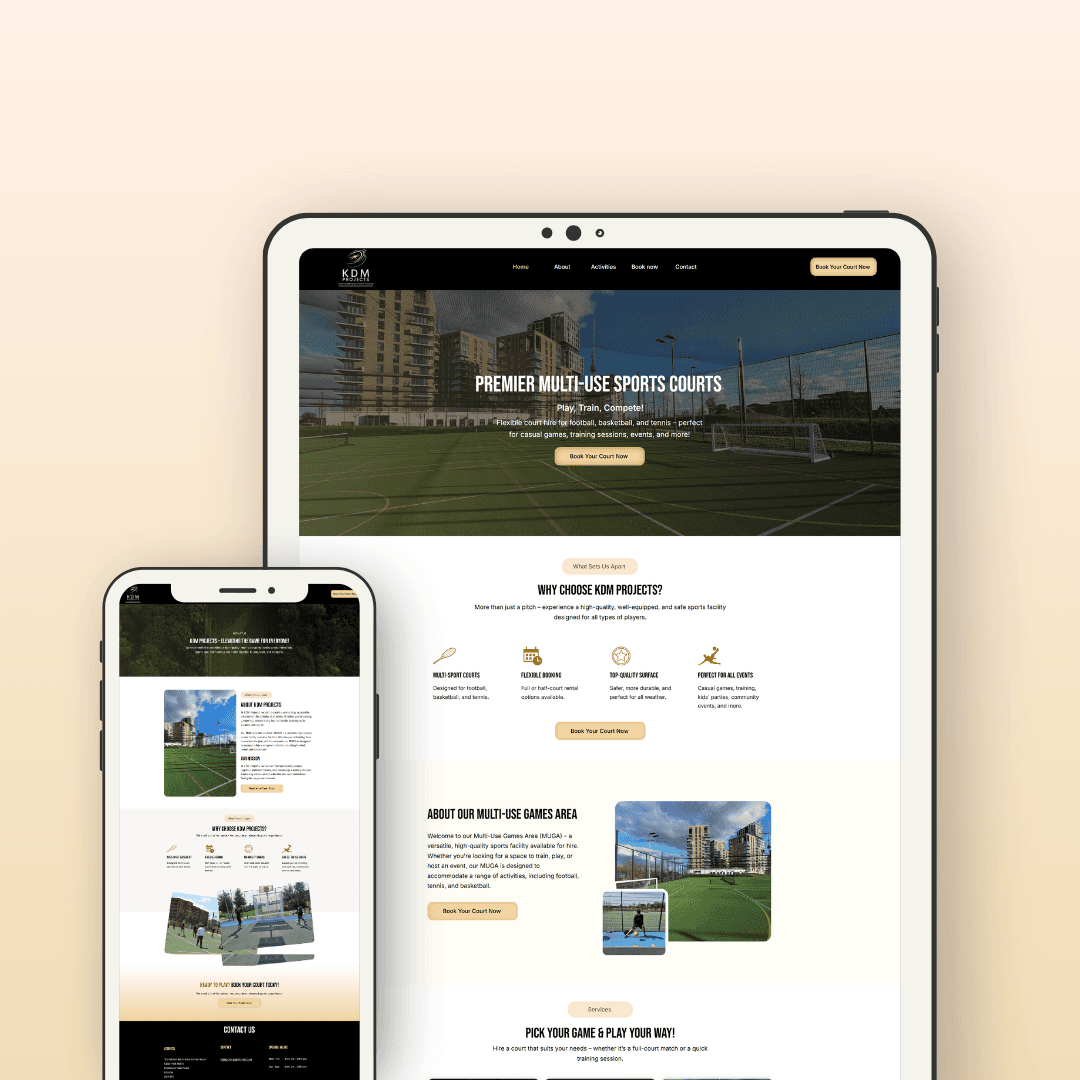 KDM Projects manages a premium multi-use sports facility offering court hire for football, basketball, and tennis.
