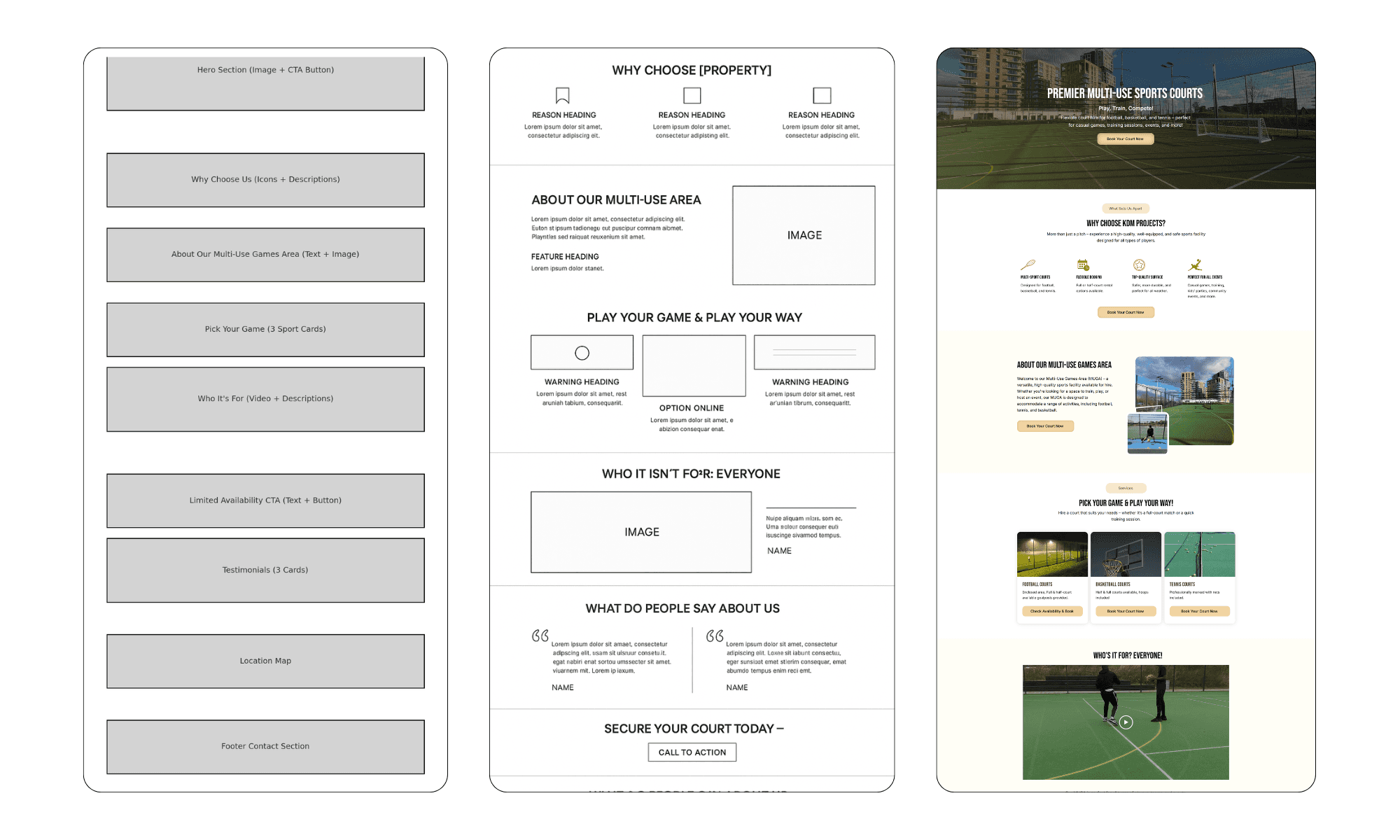 Sketching how the location, pricing, and FAQs would align visually under each court section. This phase ensured the entire user flow could be experienced logically from start to finish without friction.